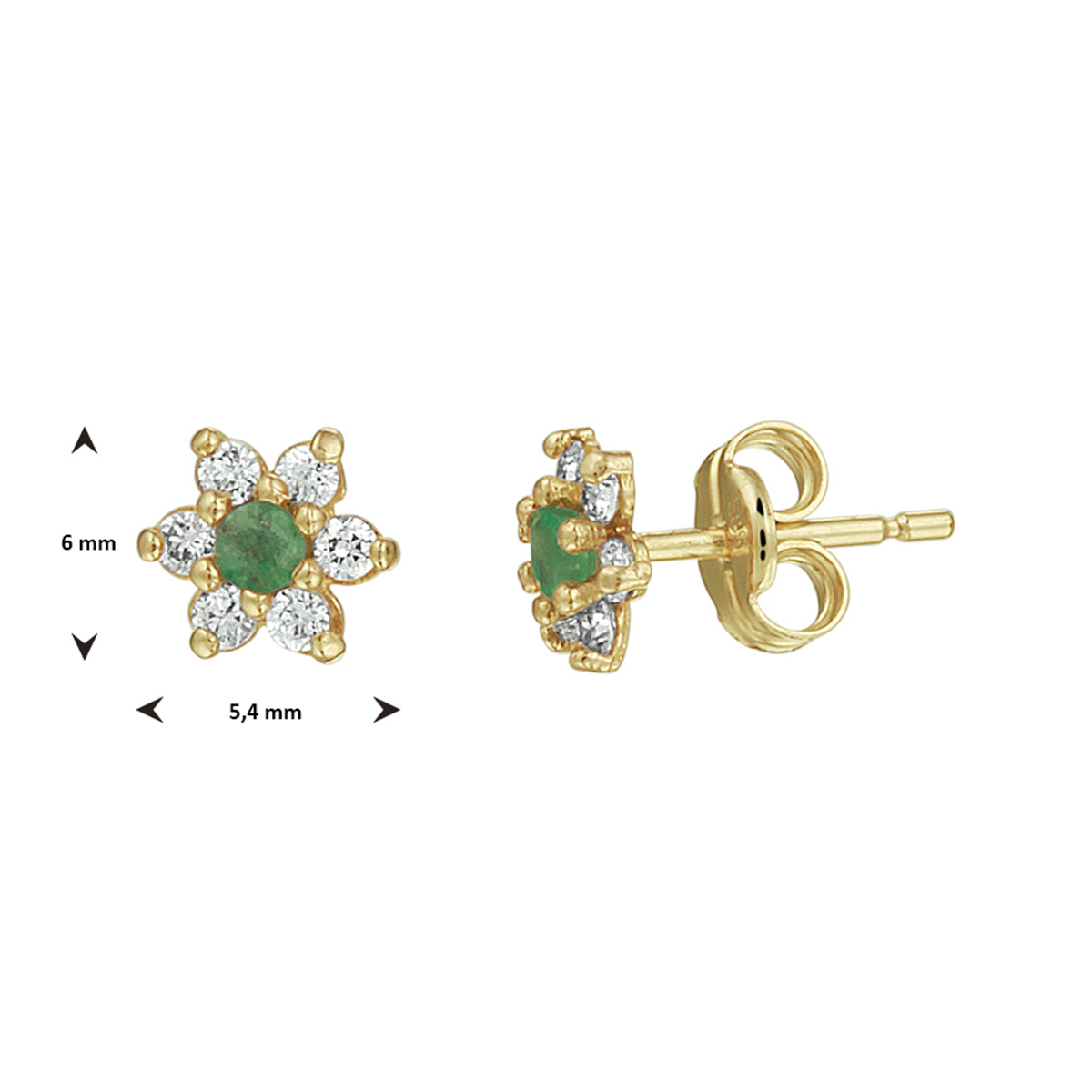 Geelgouden oorknoppen uitgevoerd met een solitaire briljant geslepen smaragd en heldere zirkonia stenen in een chaton zetting. De oorknoppen hebben een afmeting van 6x5.4mm is hebben een stevige poussette sluiting.